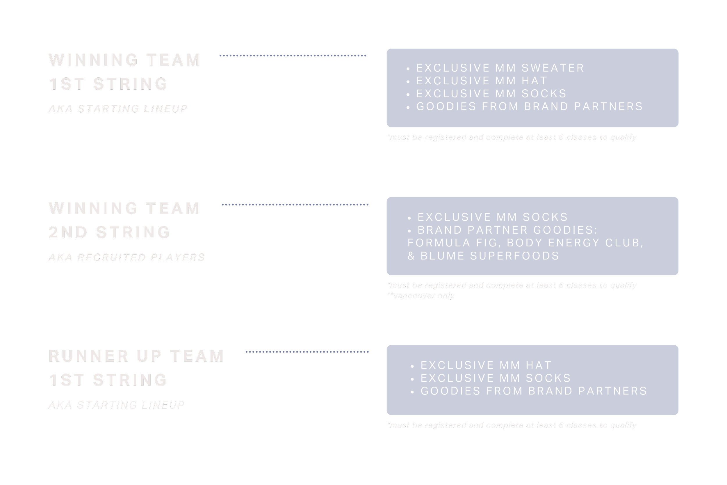 Participants who are ‘1st String Players’ on the Winning Team will receive exclusive MM Hoodie, Hat, Socks & brand partner goodies.
